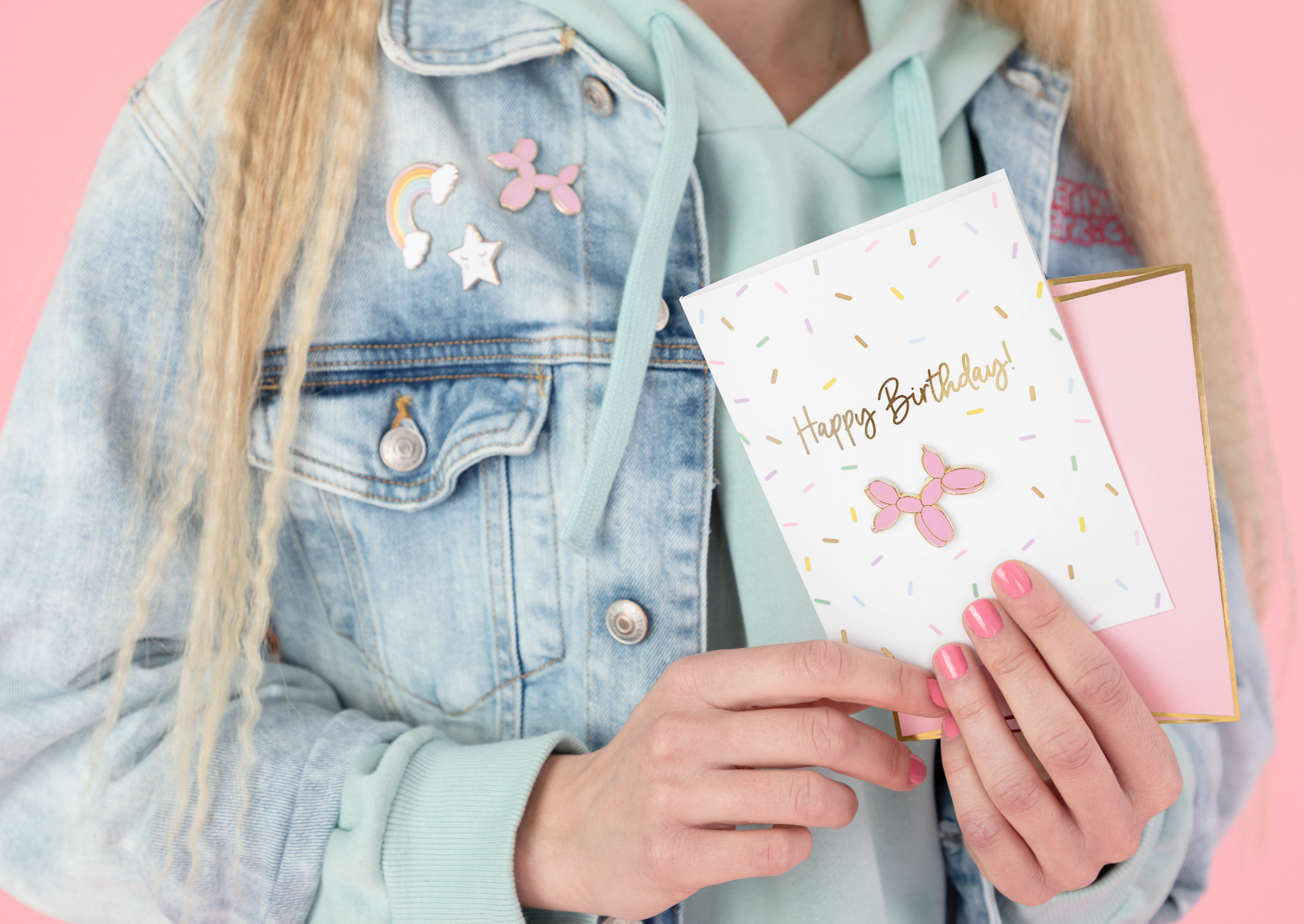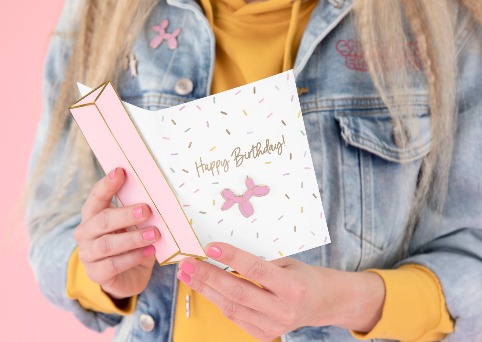 Card in White color with colorful print with enamel pin in shape of Balloon Dog and White envelope with Gold metallic print, size of card approx. 4 x 5.8 in, size of enamel pin approx. 1.5 x 1.2 in.