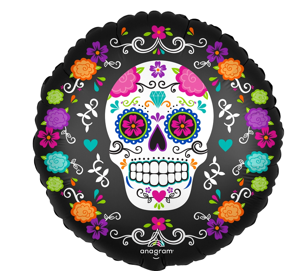 Satin Sugar Skull and Marigolds Foil Balloon – 18 in