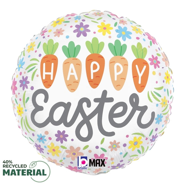 Brighten your Easter celebrations with the Happy Easter Carrots Foil Balloon 26575. This 18-inch Betallic round balloon features a colorful pattern of carrots, leaves, and cheerful lettering — perfect for Easter parties, spring décor, and festive balloon arrangements.
