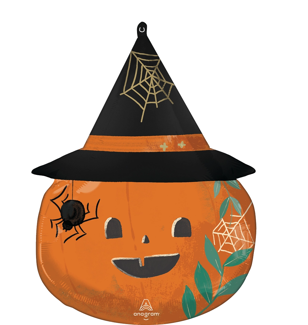 Add a charming and spooky touch to your Halloween décor with the Nature in the Night Satin Pumpkin Foil Balloon. Featuring a friendly jack-o'-lantern face with a witch hat, spiderwebs, and vibrant autumn colors, this high-quality Anagram Satin Luxe SuperShape balloon is perfect for creating a festive atmosphere at home, schools, or events.