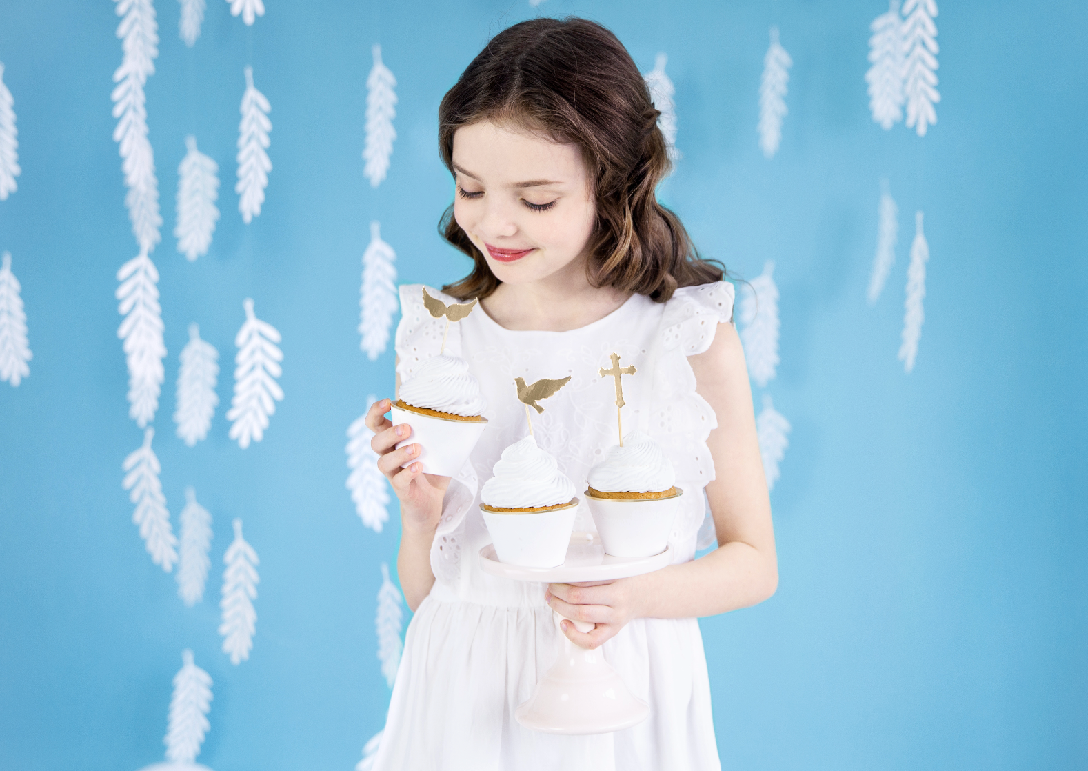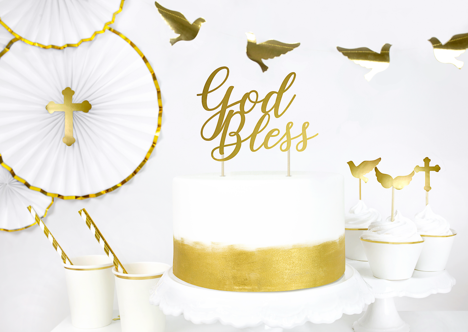 Cupcake Toppers First Communion, made of mirror Gold paper, various designs and colors. Do it yourself product. Set contains 6 shapes, 6 stickers and 6 sticks. Hight after assembling approx. 3.3 - 4.3 in. (1 pkt / 6 pc.)